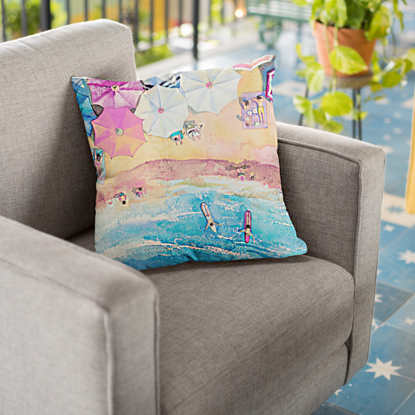 Square Pillow is a vibrant and captivating accent piece that brings the spirit of coastal living into any space. Designed to evoke the carefree joy of a day spent by the sea, this pillow features a stunning beach scene filled with bold colors and lively details.